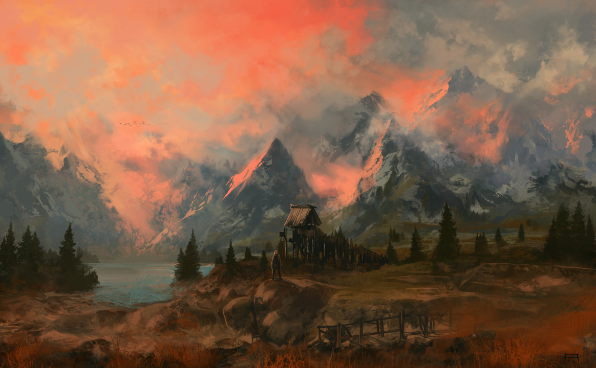 视觉、插图、山、城市、水、风景、长老卷轴、游戏CG