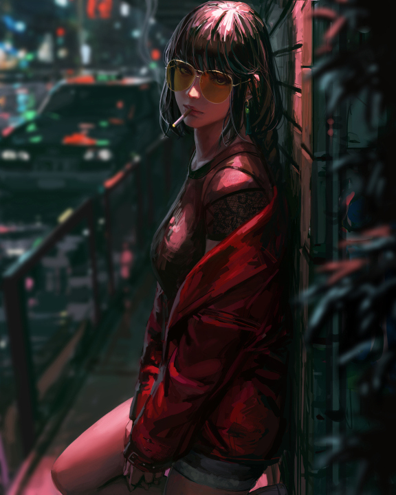 女人、原创人物、古维兹、街道、夜晚、绘画、眼镜
