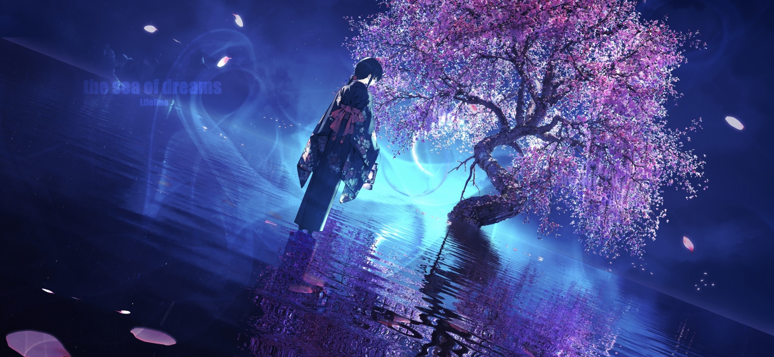 站立、动漫、动漫女孩、倒影、水、树木、花瓣、和服