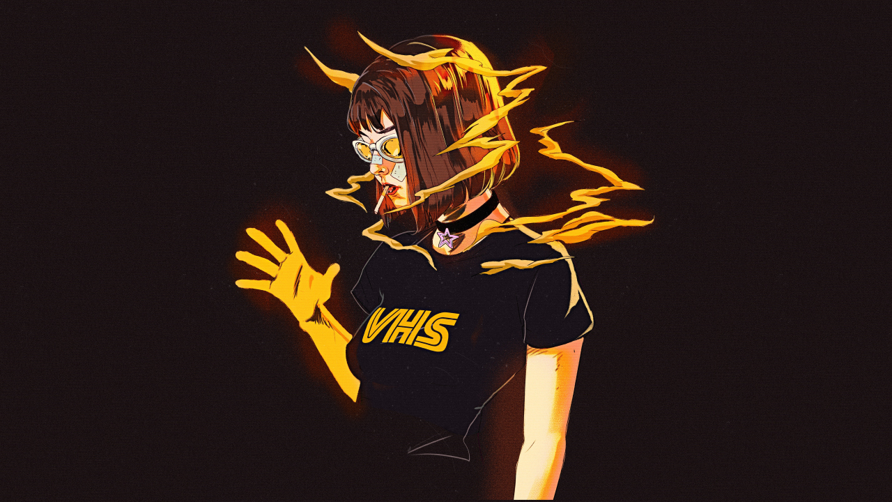 女人、短发、深色头发、眼镜、窒息、数码艺术、插图、极简主义、黑色、黑色背景、烟、烟雾、噪音、简单背景、项链、创可贴