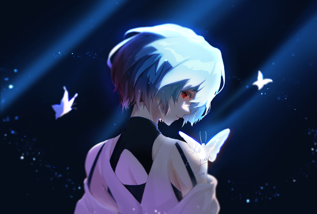 红色眼睛、蓝色头发、短发、微笑、动漫、女孩、蝴蝶、霓虹、新世纪福音、图片、简单背景、昆虫、绫波丽