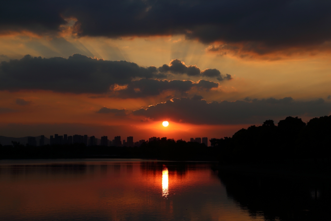 阳光、夕阳辉光、日落、自然、中国、水、倒影、天际线、城市、风景