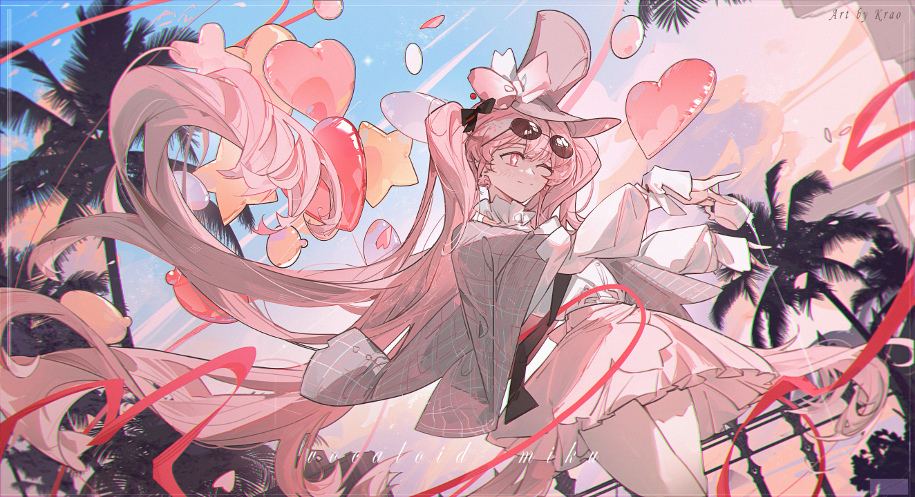 长发、站着、动漫、女孩、帽子、太阳镜、星星、眼睛、天空、云、阳光、棕榈树、杯子、气球、初音、小提琴、夕阳辉光、日落、裙子