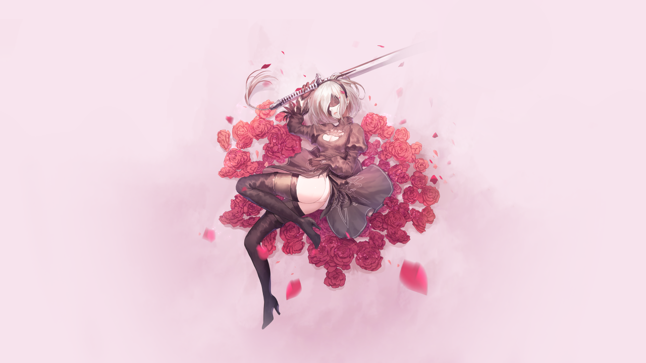 尼尔、机械纪元、剑、简单背景、玫瑰