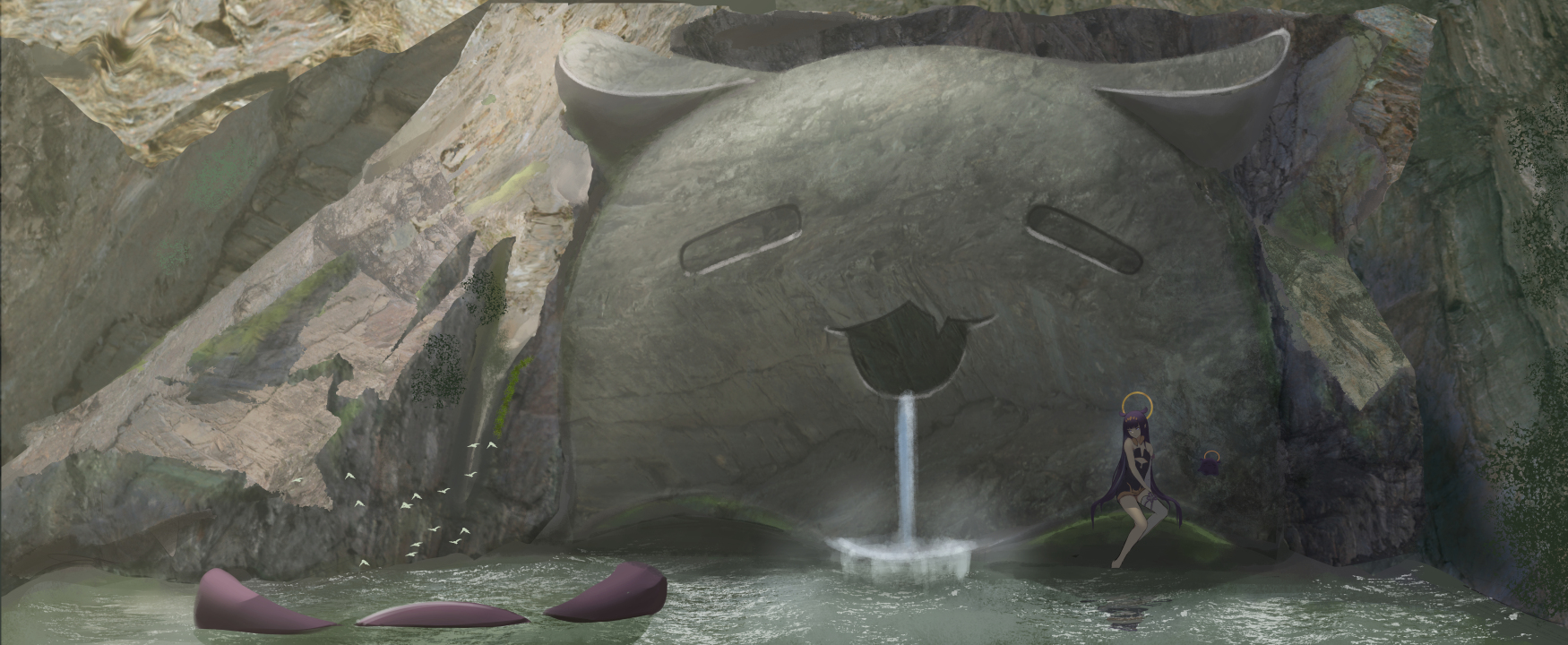 女人、坐着、长发、紫色头发、尼诺美、动漫、女孩、雕像、鸟、岩石、水、瀑布、紫色眼睛、丢失、丝袜、白色丝袜、高田