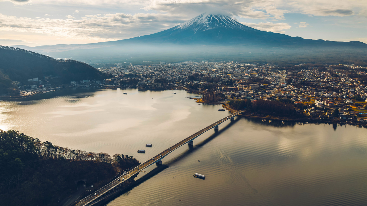 自然、风景、树木、河流、水、桥梁、城镇、雾、天空、云、船、远景、无人机、照片