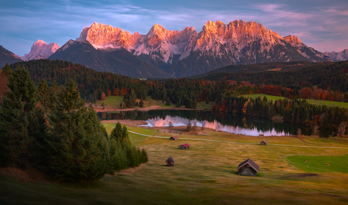 自然、风景、天空、云、山脉、树木、草、田野、房屋、小屋、湖泊、雪山、松树、秋天