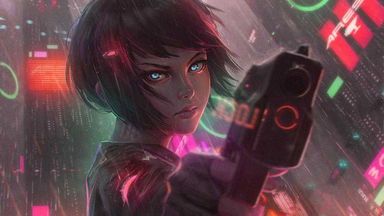 赛博朋克世界中的持枪女孩