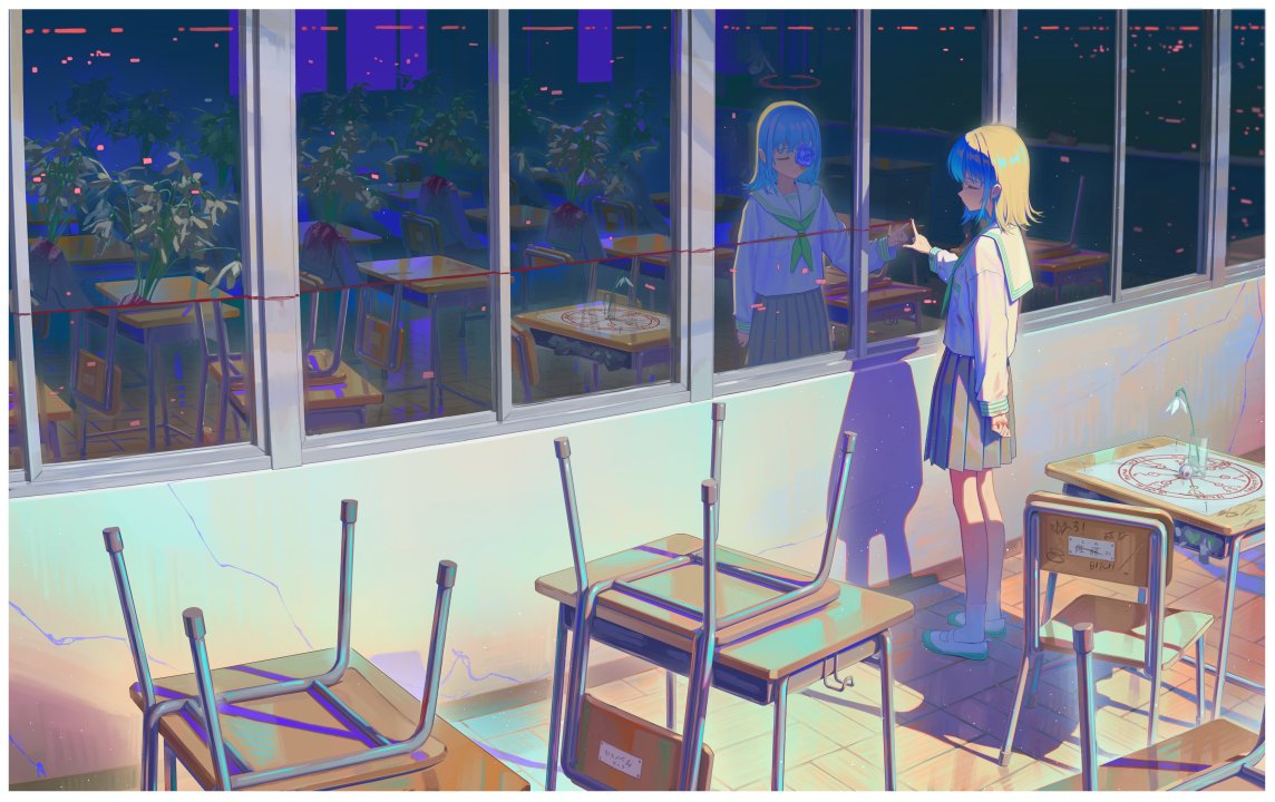 女学生、动漫、女孩、校服、反光、教室、窗户、蓝玫瑰