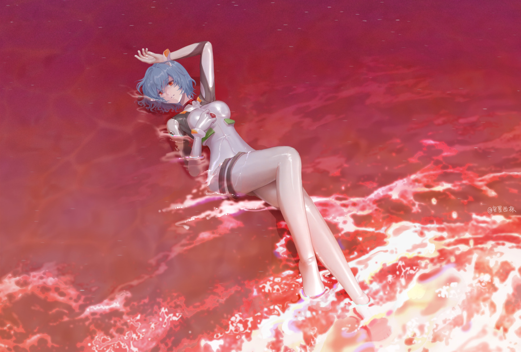 短发、蓝色头发、动漫、女孩、绫波丽、霓虹、新世纪福音、数码艺术、紧身衣