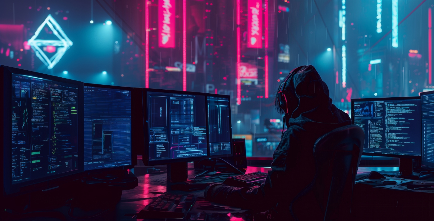 人工智能艺术、科幻小说、赛博朋克、黑客、屏幕、耳机、霓虹灯、未来派