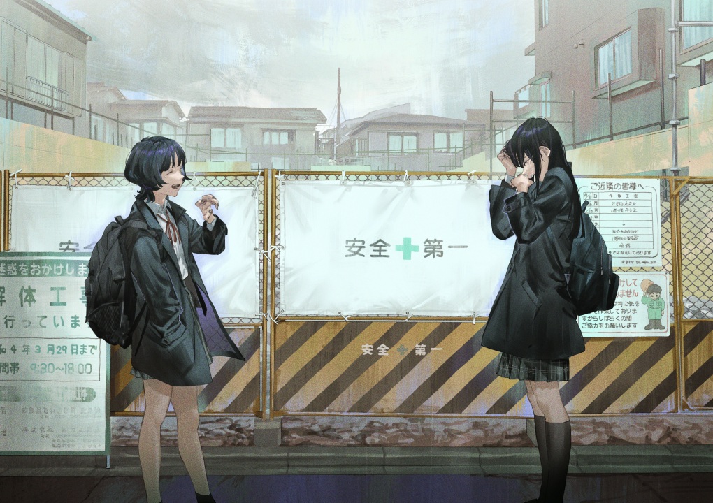 眼泪、站着、女学生、短发、动漫、女孩、栅栏、裙子、校服、建筑、哭泣、背包、天空、云