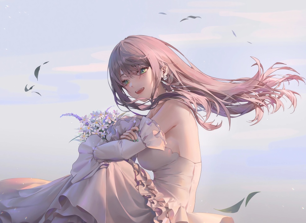 长发、张嘴、绿眼睛、微笑、坐着、双臂交叉、动漫、女孩、婚纱、飘动、天空、云、树叶、耳环、简单背景、极简主义、艺术