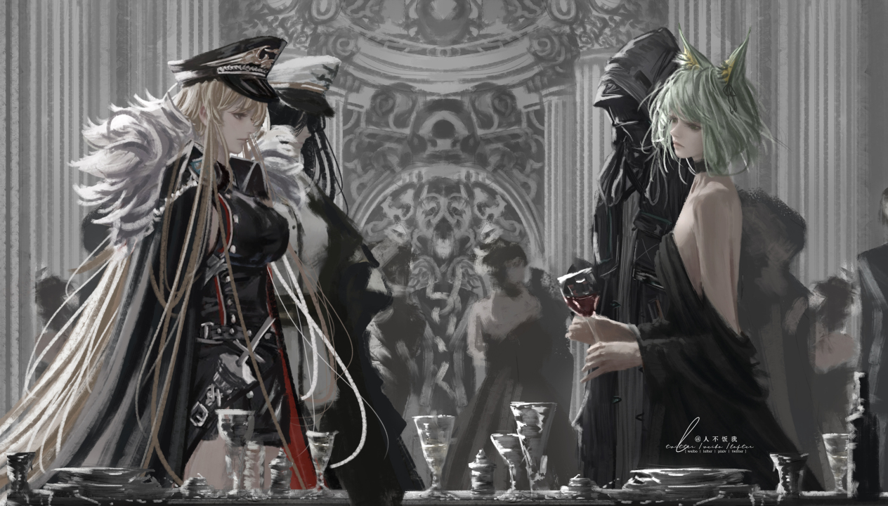 蓝眼睛、金发、长发、苍白、站着、博士、蔚蓝档案、军装、金边军帽、军大衣、军帽、尖帽、帽子、铁十字、黑色衣服、披肩、毛皮装饰、香槟、动漫、女孩