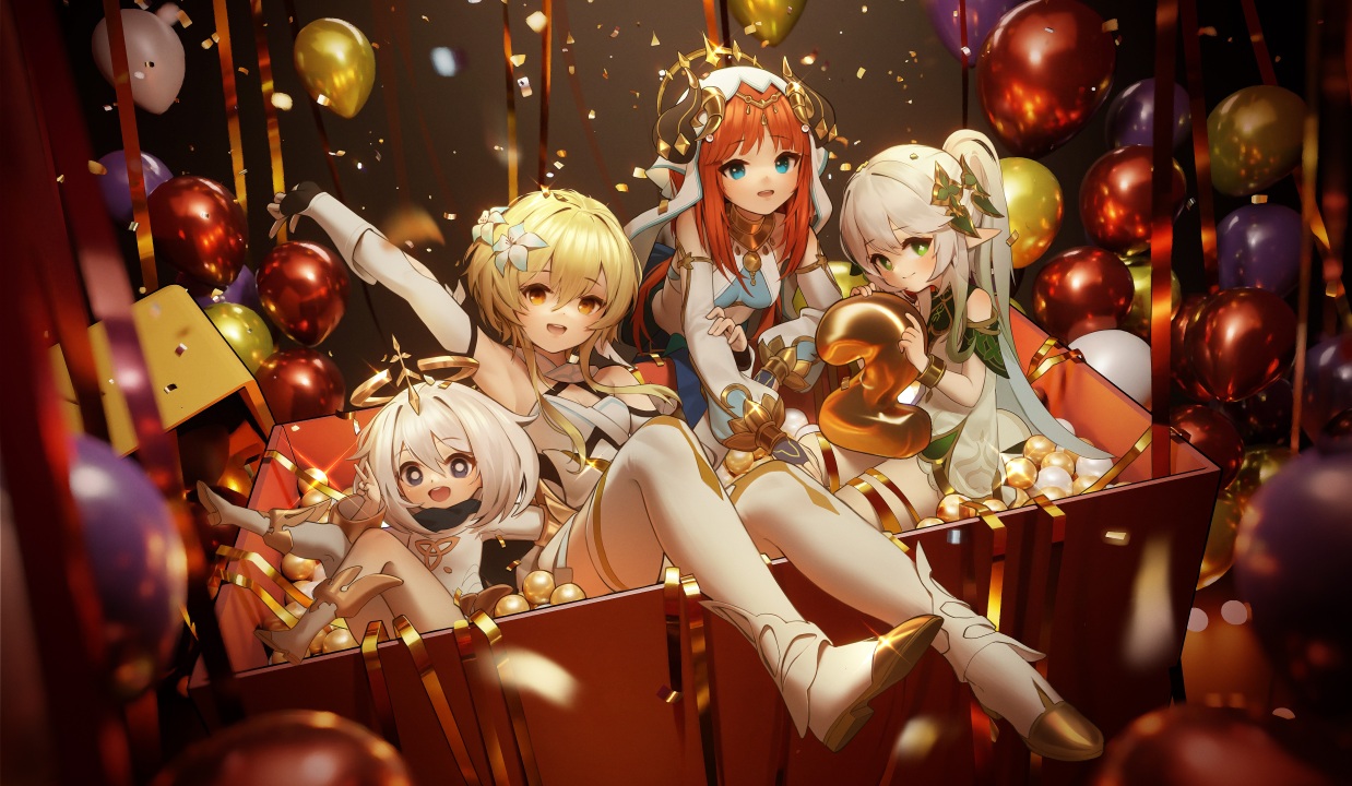 原神、动漫、女孩、派蒙、气球、五彩、纸屑