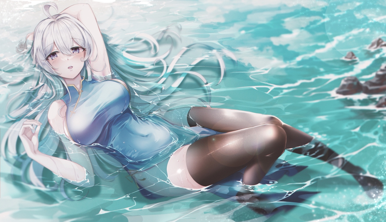 长发、躺着、动漫、女孩、丝袜、阳光、岩石、水