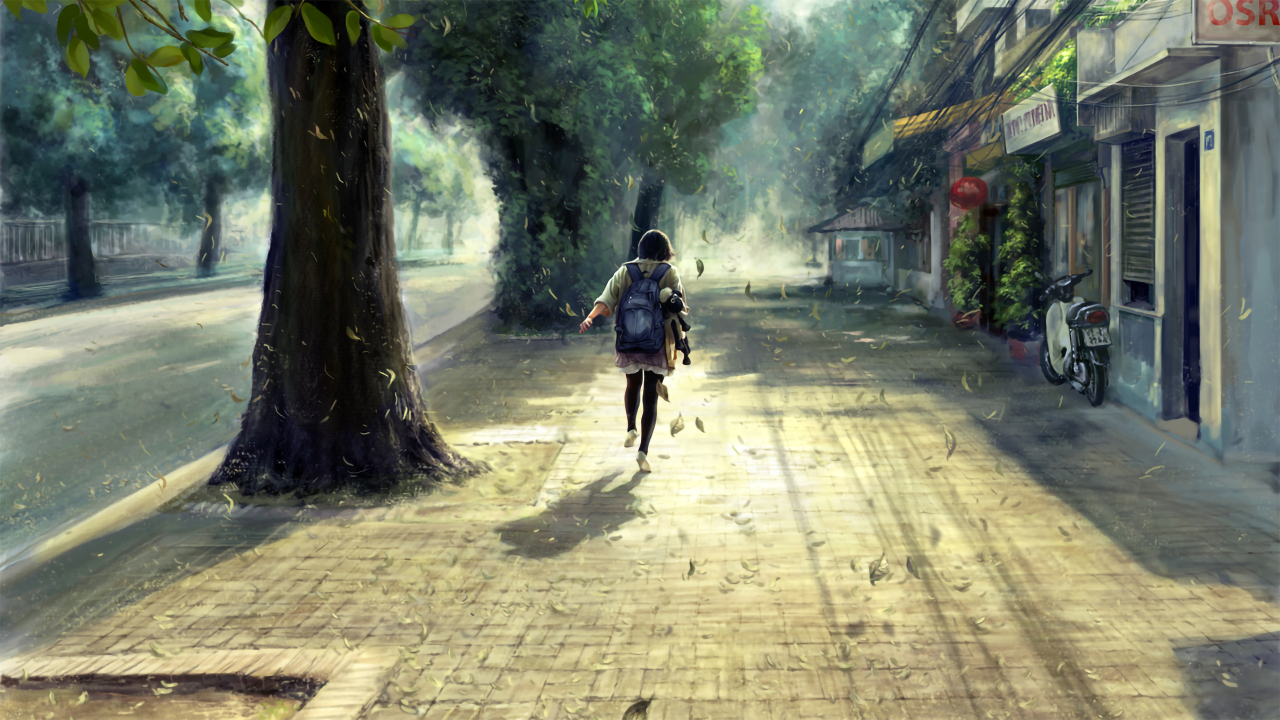 女学生、动漫、女孩、滑板车、校服、鸟、路标、城市、景观、日落、夕阳辉光、猫、云、动物