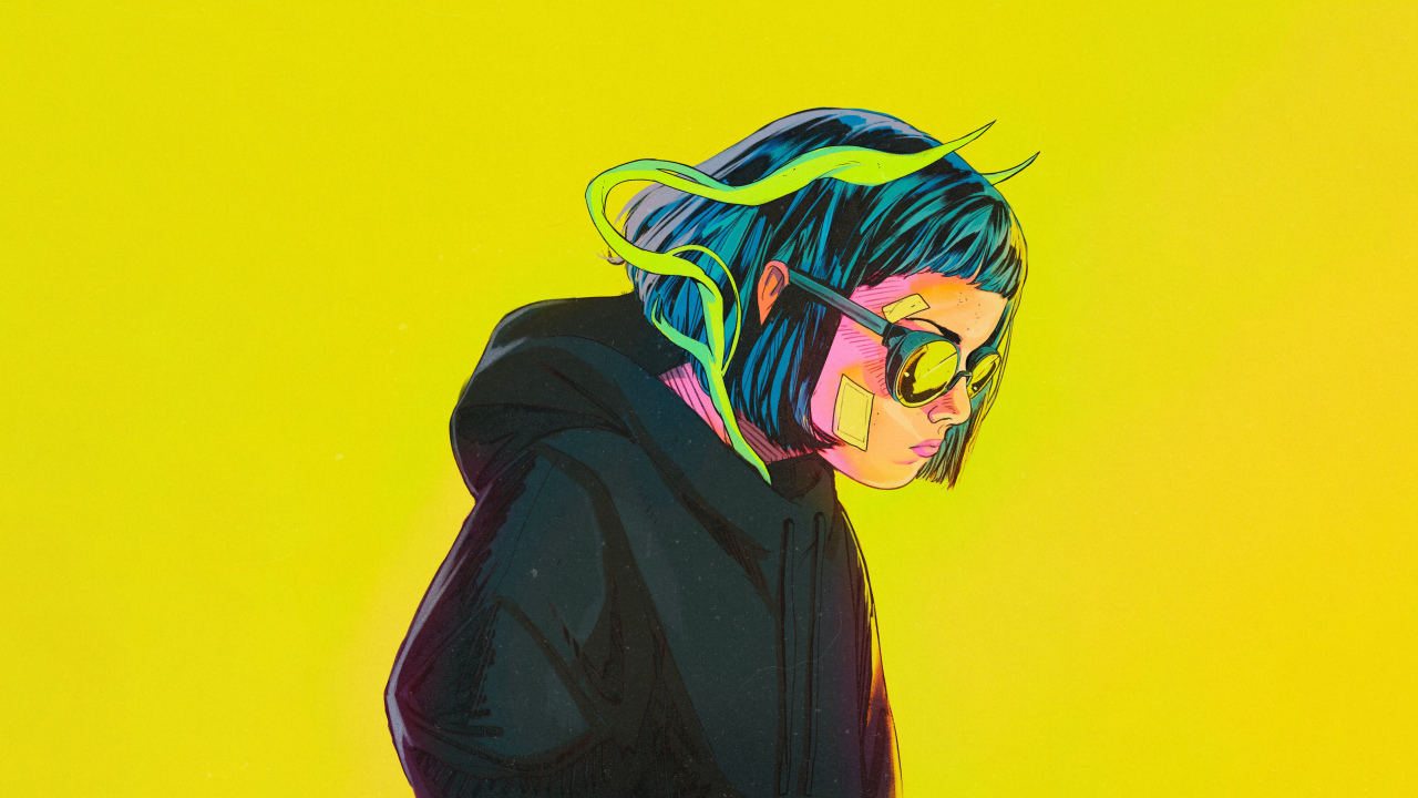 短发、女性、科幻、眼镜、简单背景、烟雾、黄色、极简主义、赛博朋克