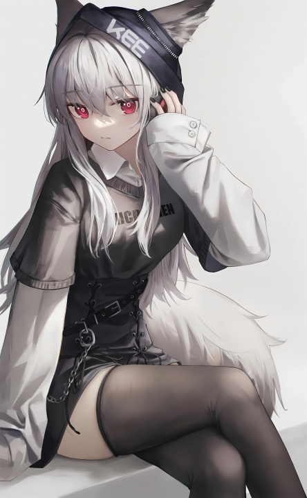 坐着、狼耳、狼尾、长发、白发、动漫、女孩、长袜、狼女