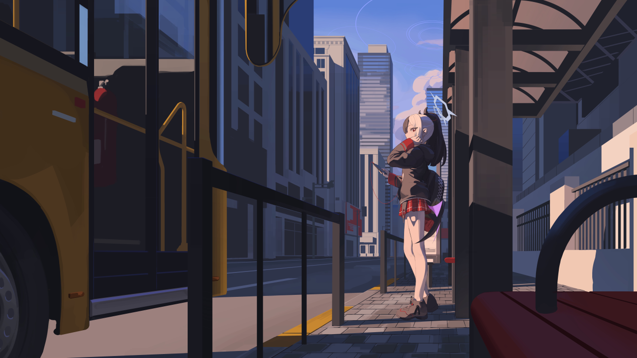动漫女孩在公交车站等待