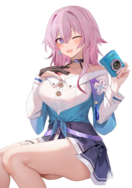 坐着、长发、崩坏、星际铁路、动漫女孩、脸红、相机、简单背景、白色背景、极简主义