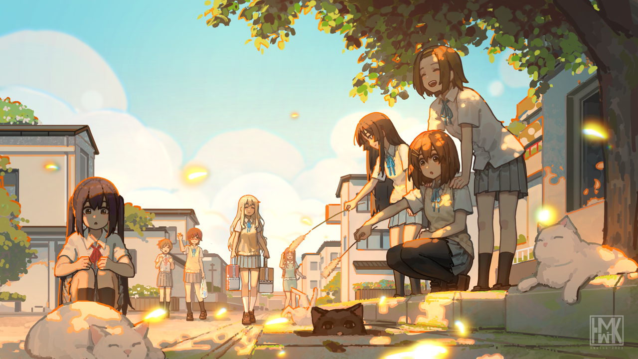 眨眼、女学生、蹲着、长发、短发、动漫、女生、动物、天空、猫、云、街道、校服、AI艺术、建筑