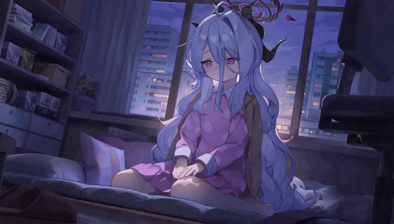 白色头发、长发、蔚蓝档案、紫色眼睛、动漫女孩、睡衣、窗户、号角、室内、建筑、萝莉