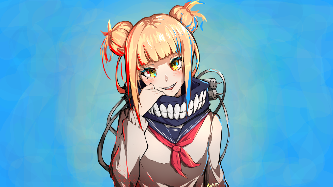 长发、蓝眼睛、微笑、脸、手套、银发、尖牙、动漫、女孩