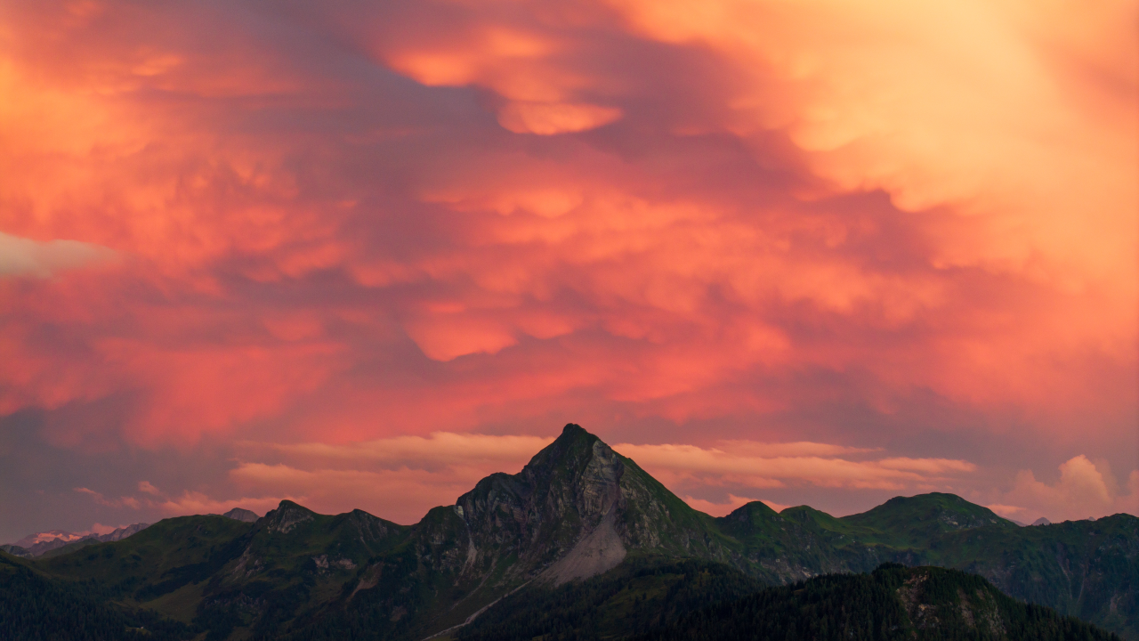 自然、风景、山脉、湖泊、倒影、树木、云、天空、粉红色云、橙色云、湖