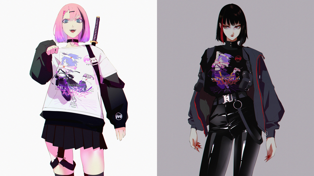 粉色头发、蓝色眼睛、红色眼睛、原创人物、动漫、动漫女孩、AI艺术、黑发、项链、剑、夹克、长袖、裙子、大腿高、红色口红、枪、皮套、腰带