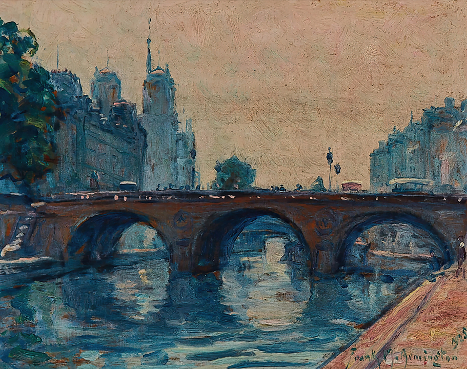 经典艺术、油画、签名、桥梁、水、天空、建筑、艺术品