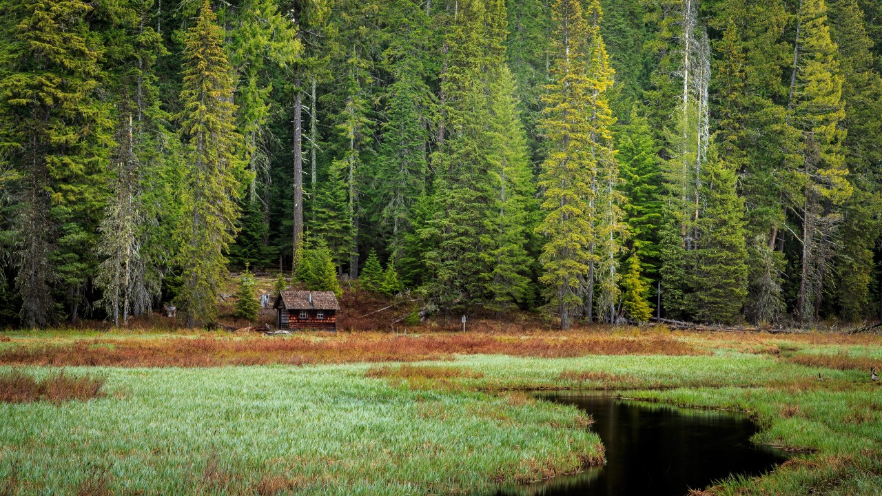 俄勒冈州、胡德山、沼泽、绿色、森林、小屋、松树、深林、美国