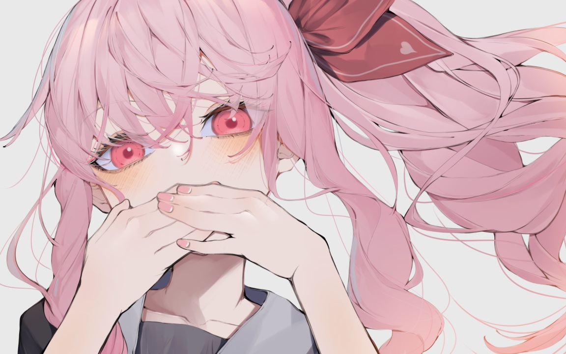粉色头发、粉色眼睛、长发、动漫、动漫女孩、脸红、背景简单、白色背景、极简主义、遮脸