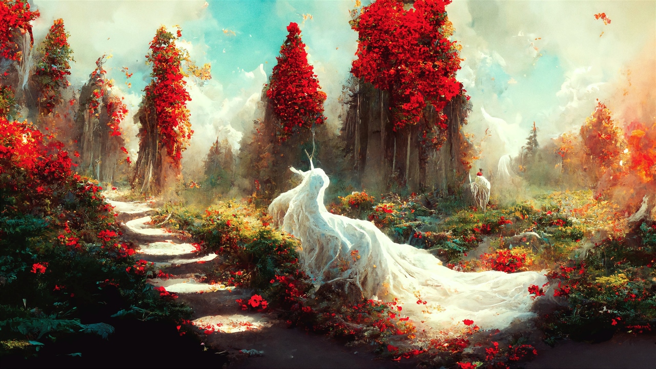 树、独角兽、树木、风景、红色背景、红色花朵、花卉、植物、AI艺术、艺术