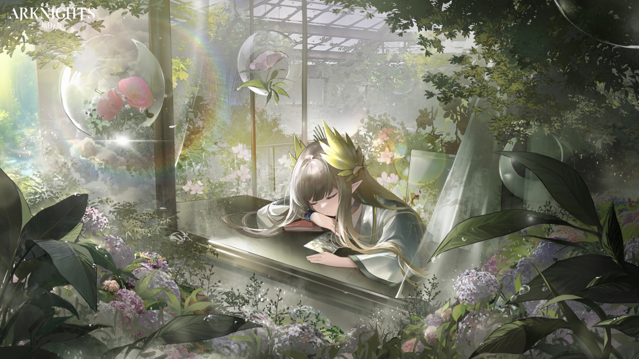 眼睛、长发、骑士、耳朵、树木、长袖、睡觉、头饰、阳光、气泡、叶子、露珠、动漫女孩、动漫、绿色、书籍、花朵、明亮、植物
