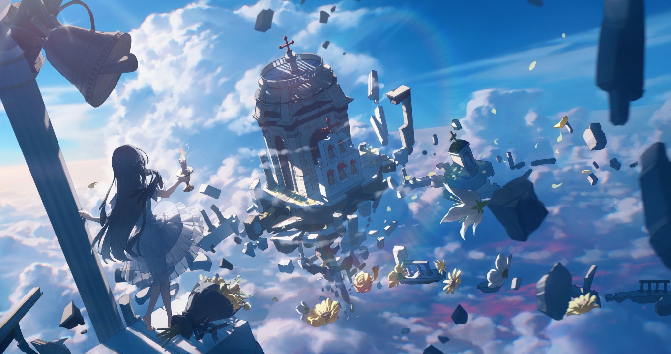 长发、花束、黄色花朵、积云、天空、连衣裙、钟声、花瓣、云彩、蜡烛、废墟