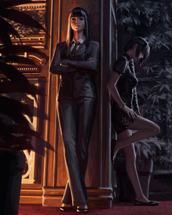 女人、交叉双腿、原创人物、西装、旗袍、黑发、黑色服装、概念艺术、艺术品、素描、肖像展示