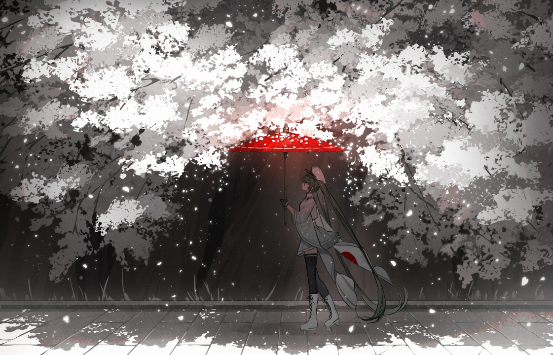长发、抬头、走路、动漫、女孩、雨伞、手套、帽子、树、花瓣、旗帜