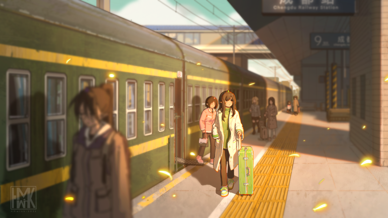 眨眼、走路、长发、动漫、女孩、AI艺术、花瓣、兽耳、火车、火车站、阳光、夹克、公文包、云