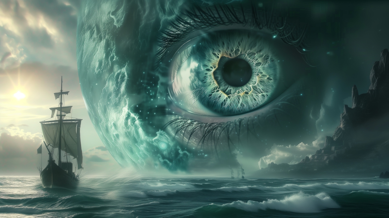 眼睛、AI艺术、超现实、大海、船、波浪、插图
