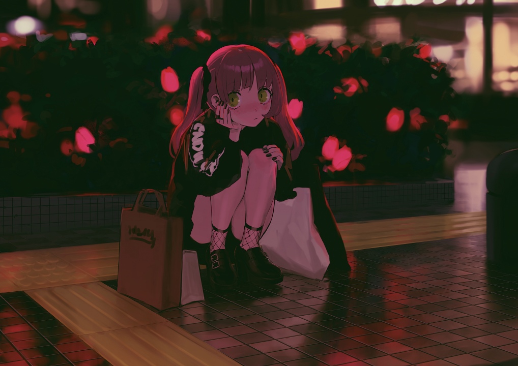 原创、人物、绿眼睛、刘海、长发、红发、跪着、动漫、女孩、夜晚、双尾、尴尬、哥特式、洛丽塔