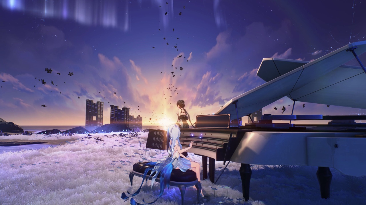 钢琴家、女学生、动漫、女孩、AI艺术、天空、自然、鲜花、黄昏、日落、太阳、阳光、风景、钢琴、晚上、蝴蝶、校服