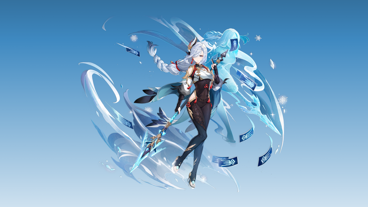 游戏CG、角色、辫子、神河、原神、简单背景、动漫、女孩、极简主义、长枪、武器、雪花