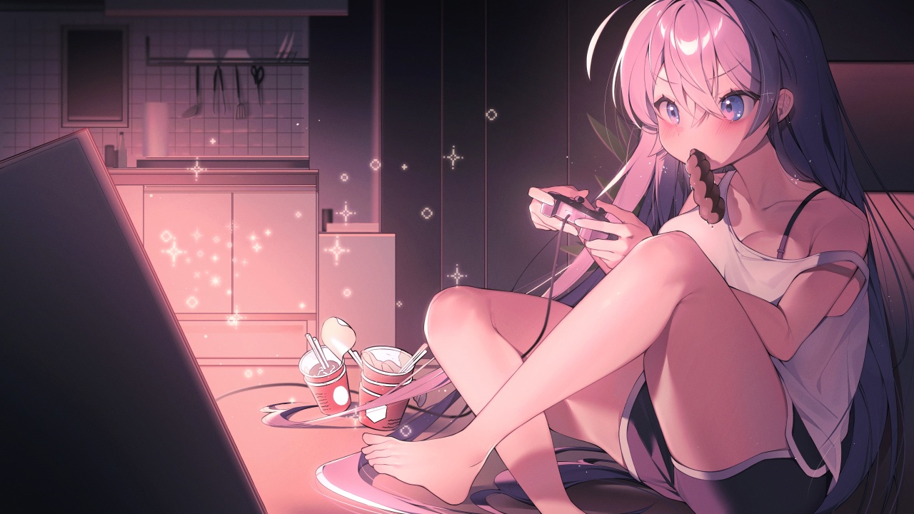 坐、长发、脚、动漫、女孩、游戏手柄、游戏CG、短裤、吃、杯子、室内、剪刀、食物