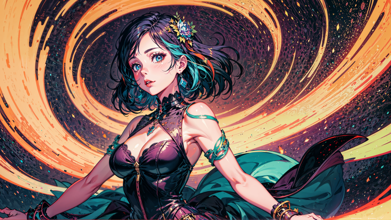 多色头发、短发、蓝眼睛、肩膀、人工智能、动漫女孩、连衣裙、五颜六色、时空旅行、科幻、奇幻艺术、魔术、照相、AI艺术