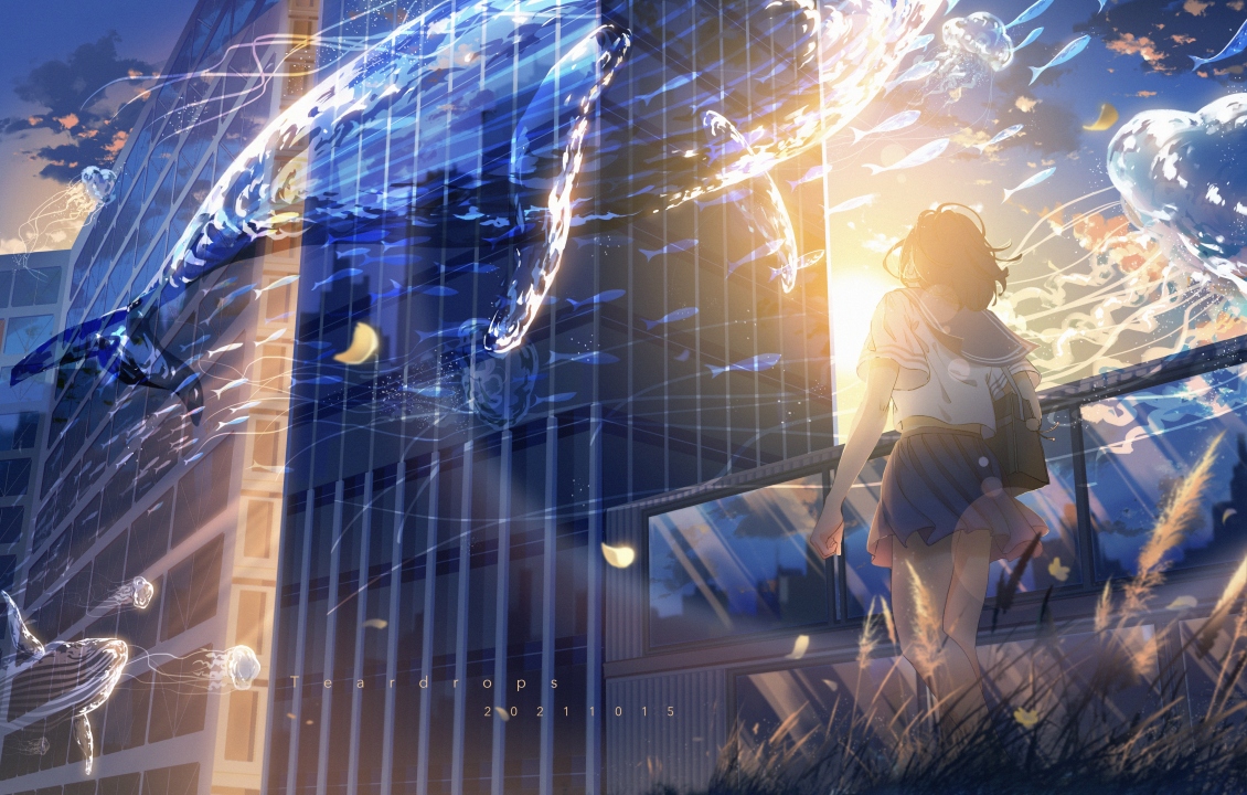 女学生、散步、动漫、动漫女孩、校服、日落、夕阳辉光、鲸鱼、水、天空、云、裙子、动物、水母、鱼、包、花