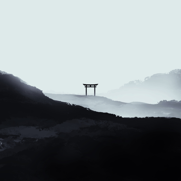 数字艺术、艺术品、插图、风景、单色、极简主义、鸟居、山脉、数字、绘画
