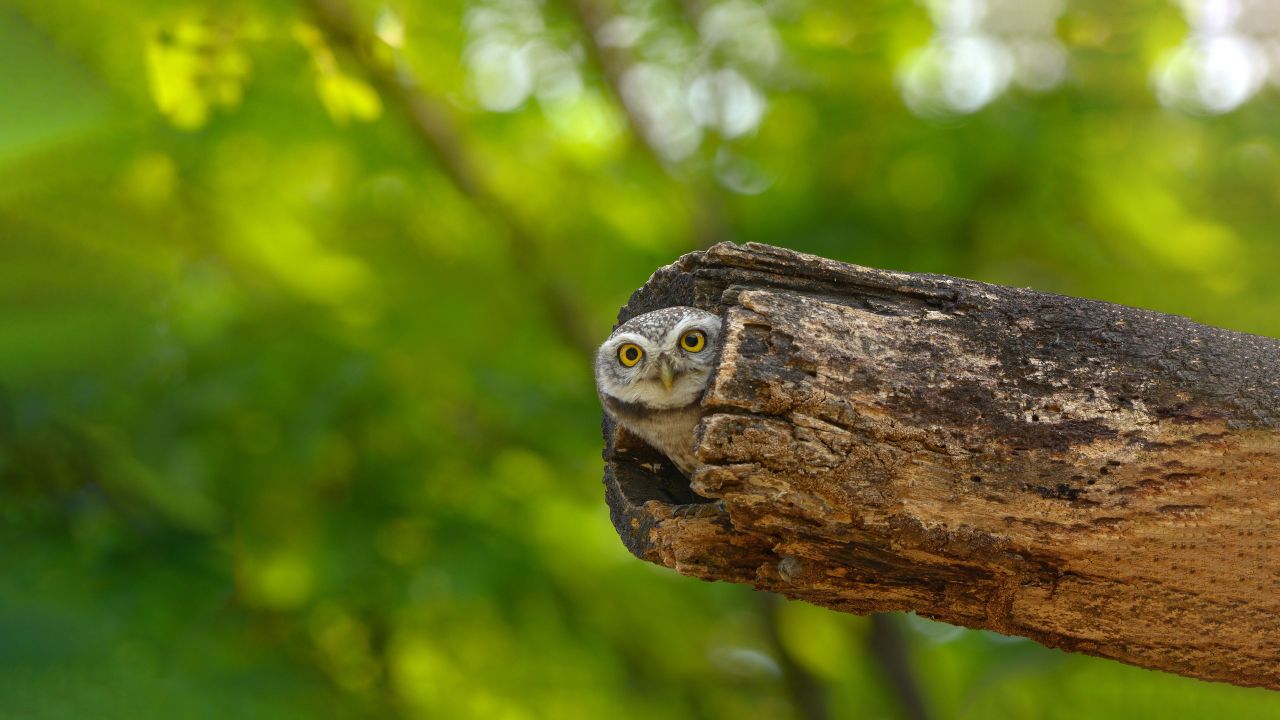猫头鹰在森林中的树桩上