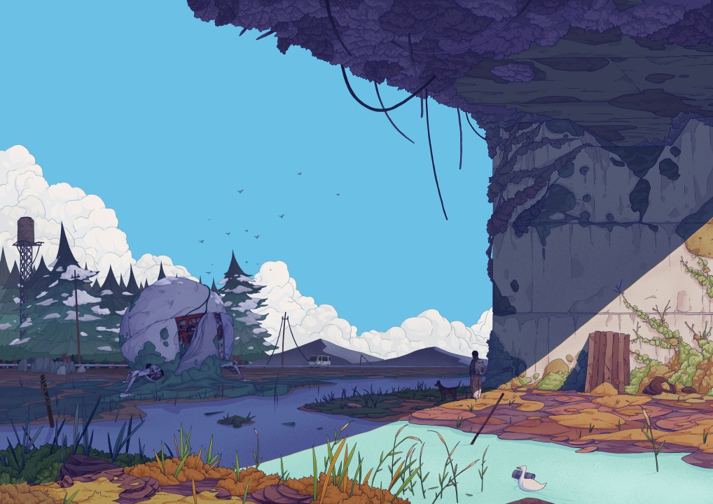数字艺术、艺术品、插图、云、森林、树、阳光、河、水、鸭子、桥下、环境、鸟、动物、狗