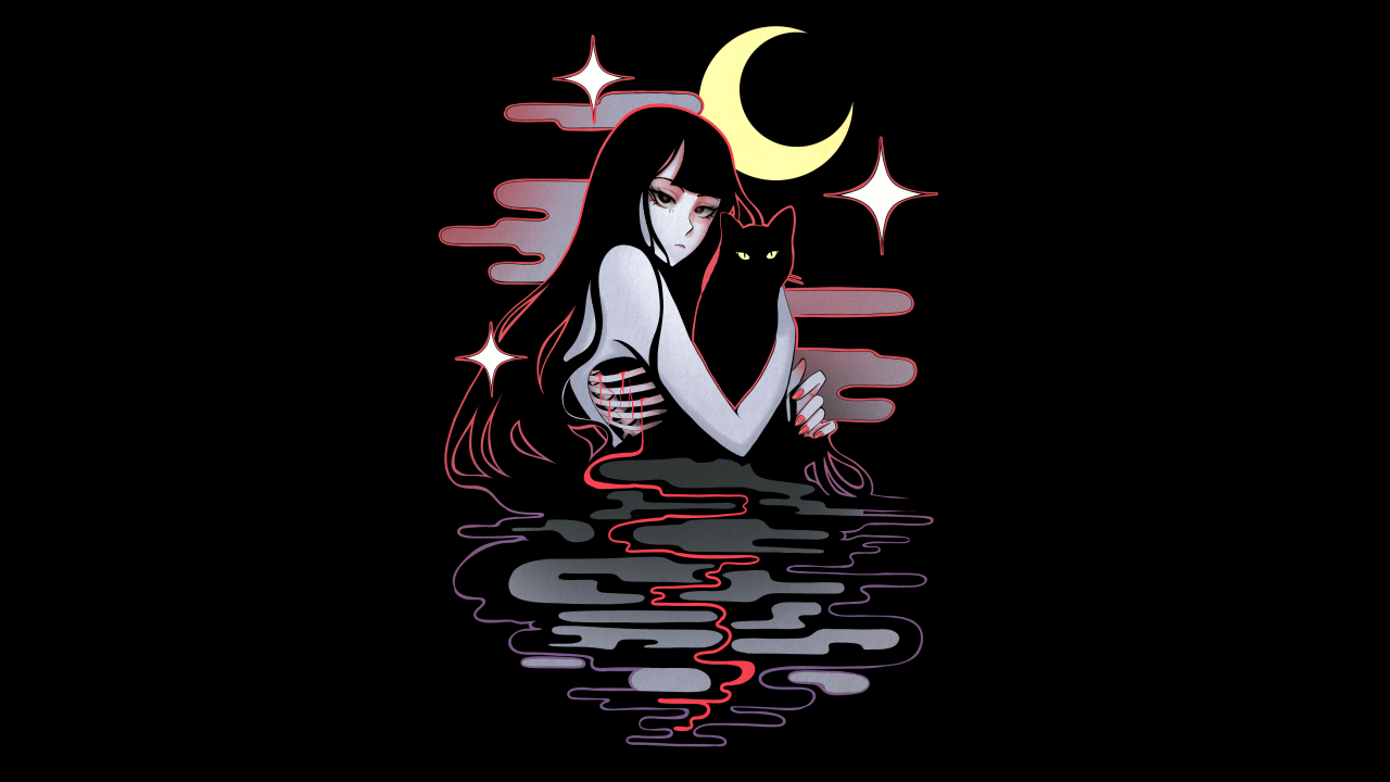 夜晚的神秘女孩与黑猫